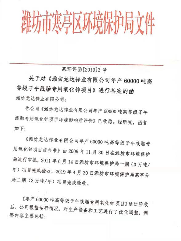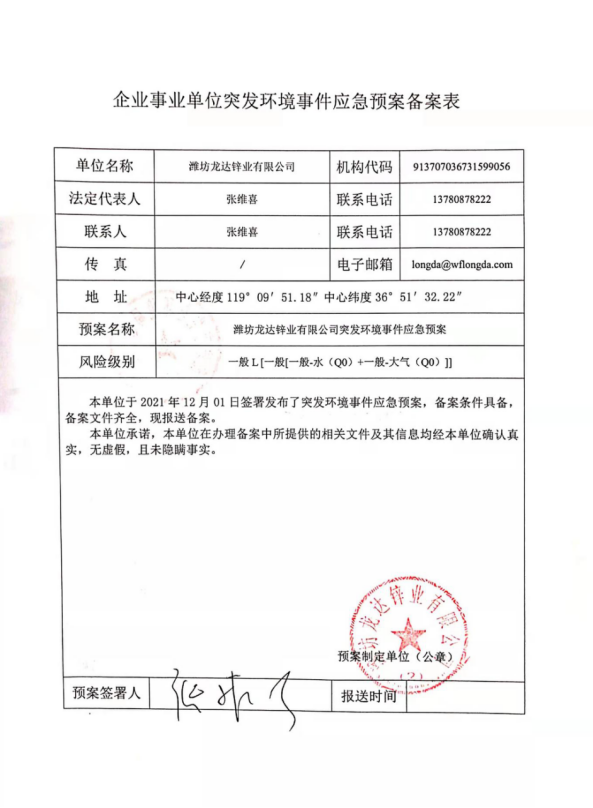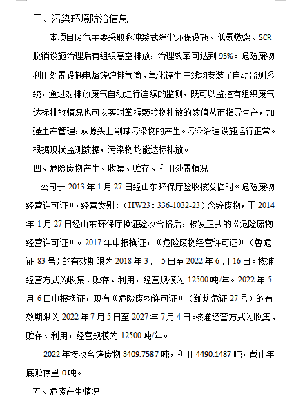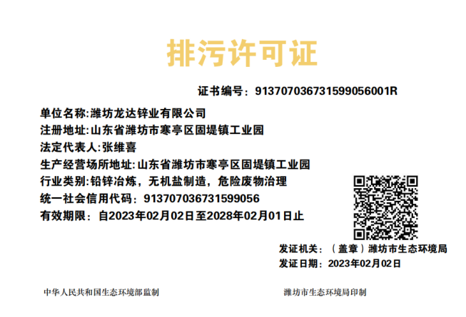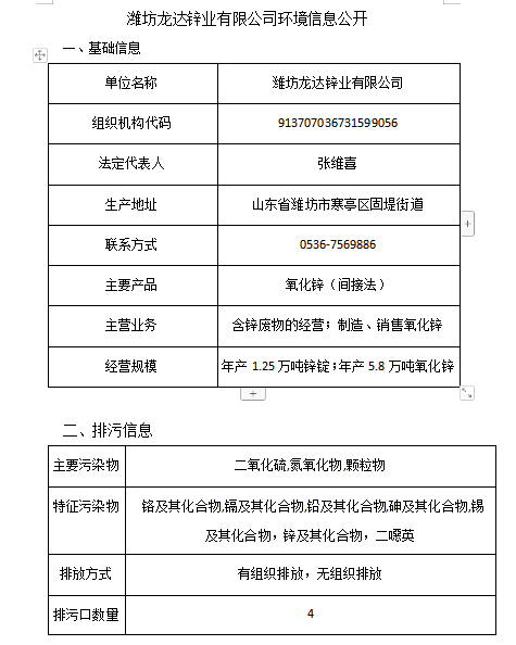 濰坊龍達鋅業有限公司污染防治信息公開20230115